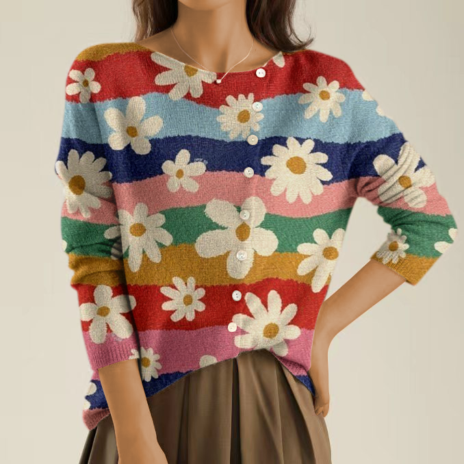 Elegant and comfortable sweater with colorful horizontal stripes and a pattern of white daisies, featuring irregular buttons