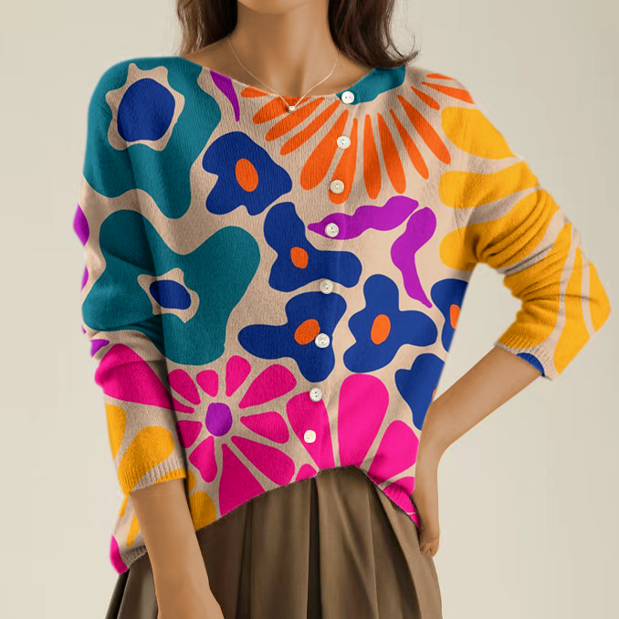 Elegant and Comfortable Sweater with Colorful, Irregular Floral Pattern and Irregular Buttons