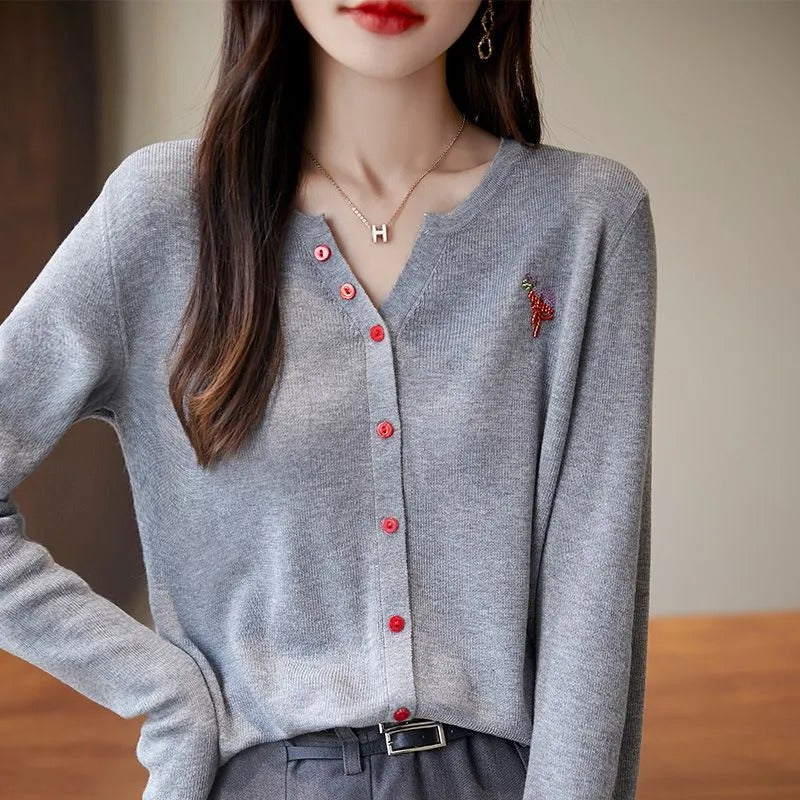 Elegant and comfortable women's cardigan in a solid color with a V-neck and red buttons
