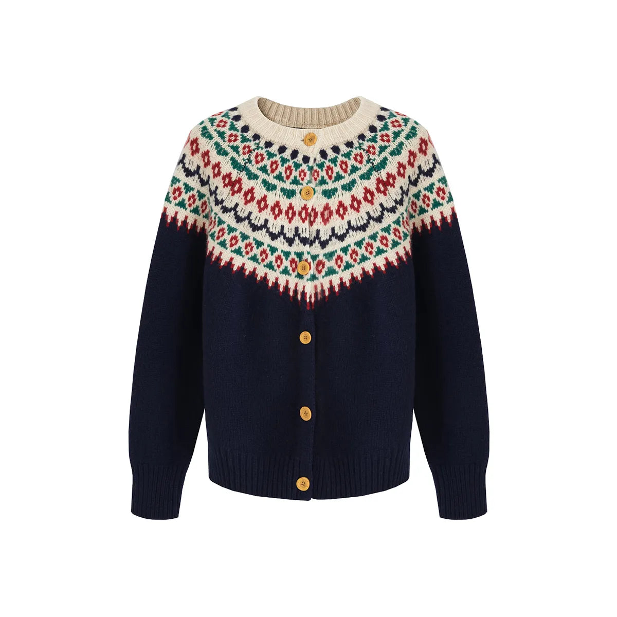 Loose and comfortable blue cardigan with a retro geometric pattern and button closure
